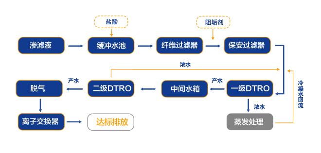 沈陽市老虎沖垃圾場積存滲濾液應急處理項目是中央環保督察督辦重點項目,該項目設計處理規模為每日1500噸(以產水計算),采用“預處理+兩級DTRO+離子交換”處理工藝,出水達到《城鎮污水處理廠污染物排放標準》(GB18918-2002)一級A標準。項目2018年3月入場施工,6月達產達標,提前半年完成督察任務,疫情期間連續安全運行,確保了系統產量和水質安全穩定。