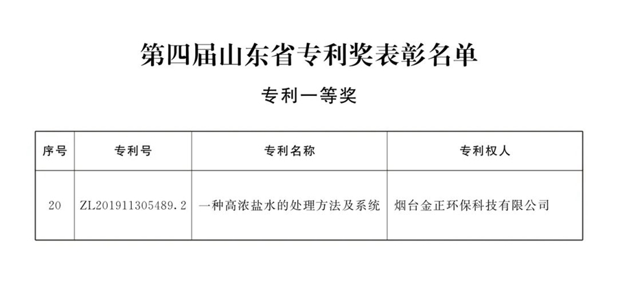日前,《山東省人民政府關于第四屆山東省專利獎勵的通報》正式公布,由煙臺金正環保自主研發的“一種高濃鹽水的處理方法及系統”(中國發明專利:ZL201911305489.2),榮獲“第四屆山東省專利獎一等獎”。